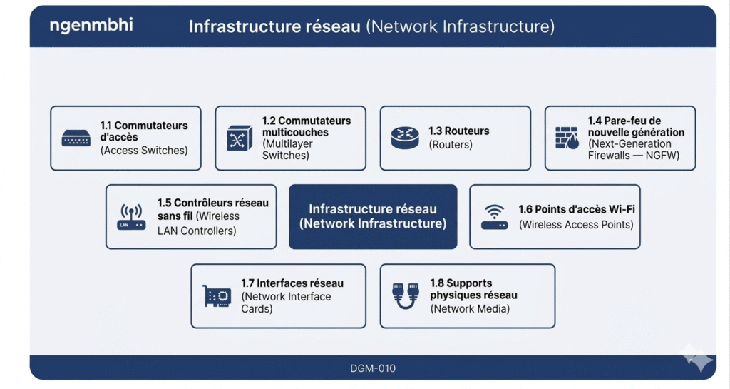 L’infrastructure réseau (Network Infrastructure) constitue l’ossature technique sur laquelle reposent les services numériques d’une organisation. Elle assure la connectivité, la circulation de l’information, la segmentation, la performance et la sécurité du système d’information (Information System — IS).